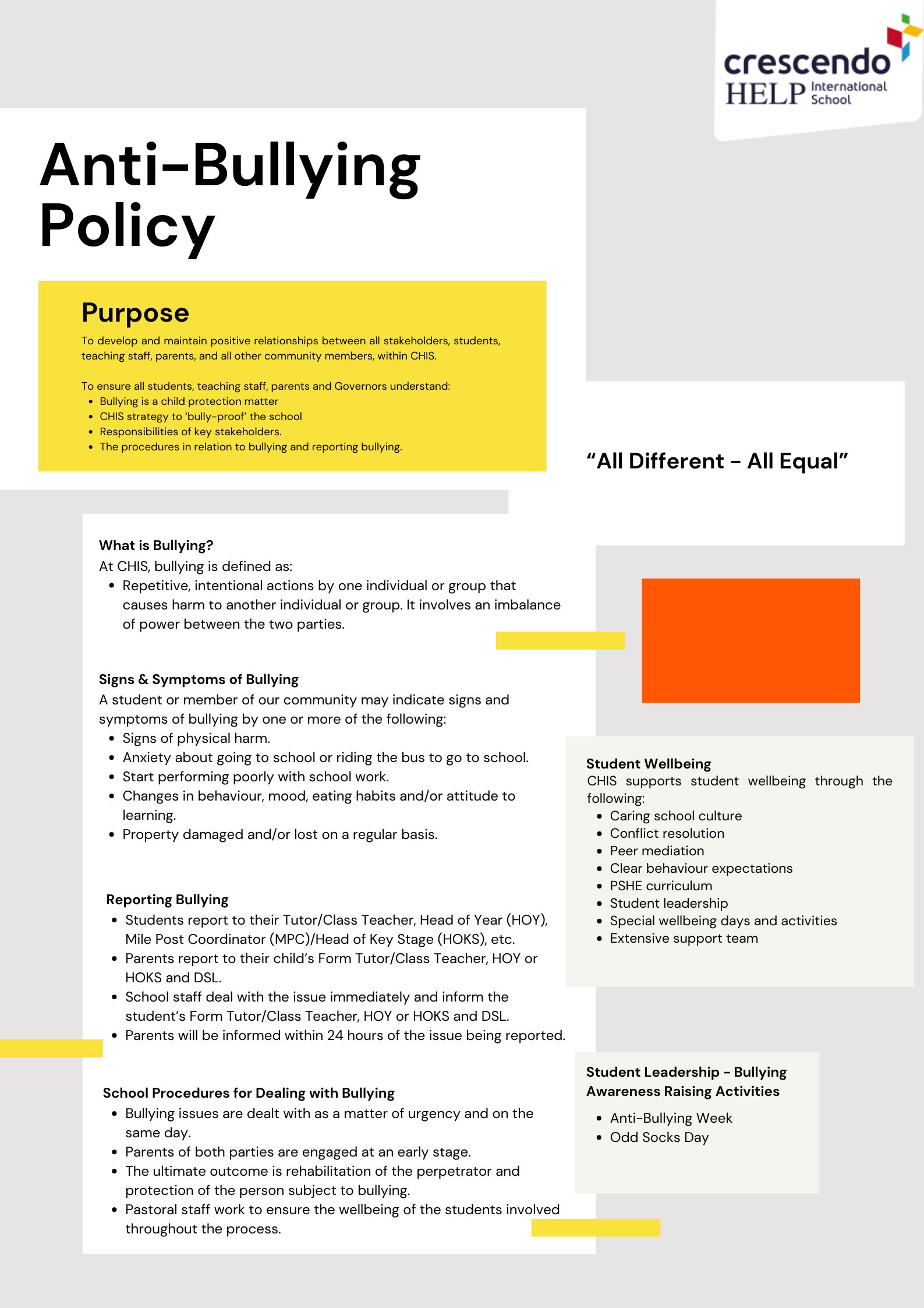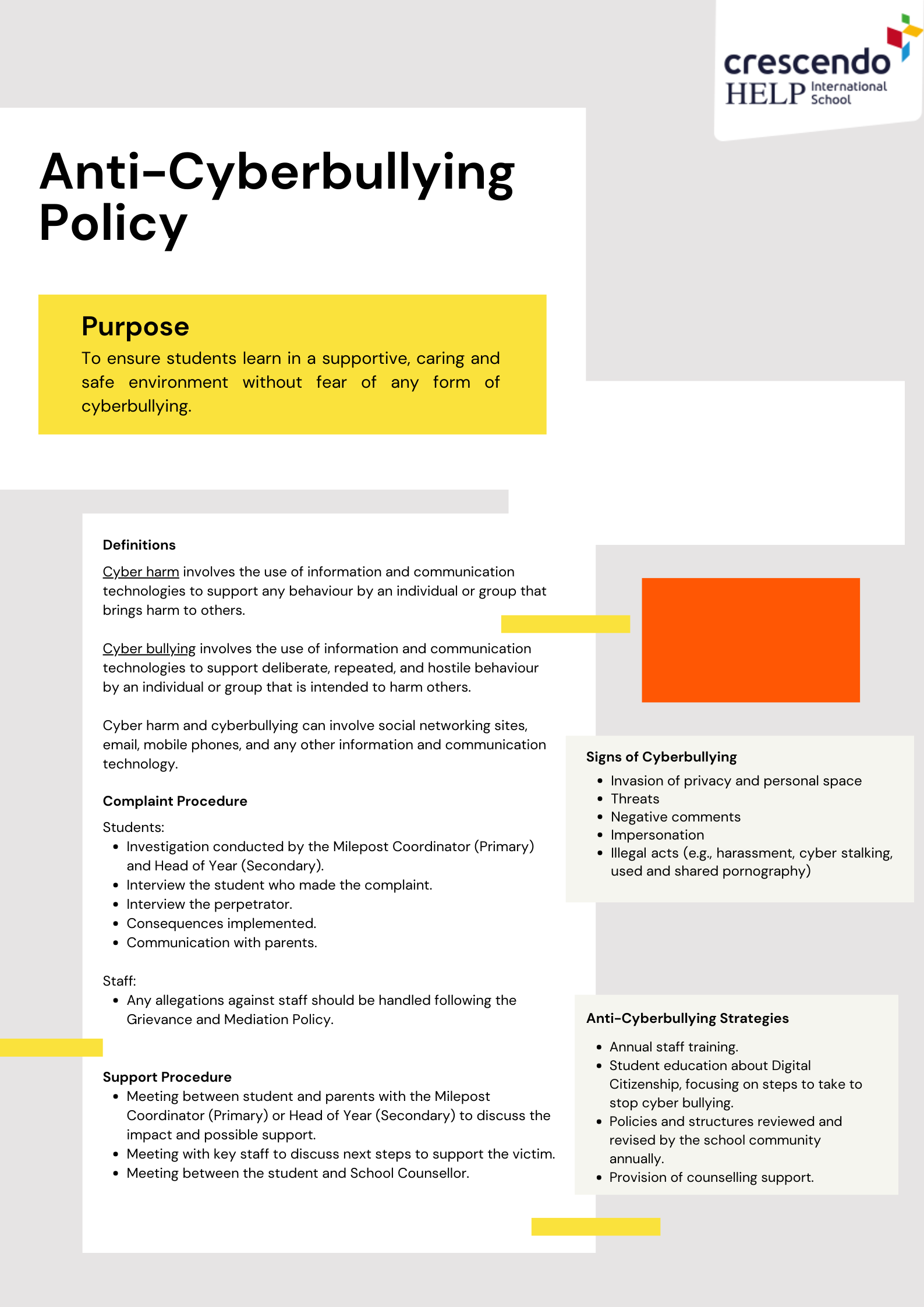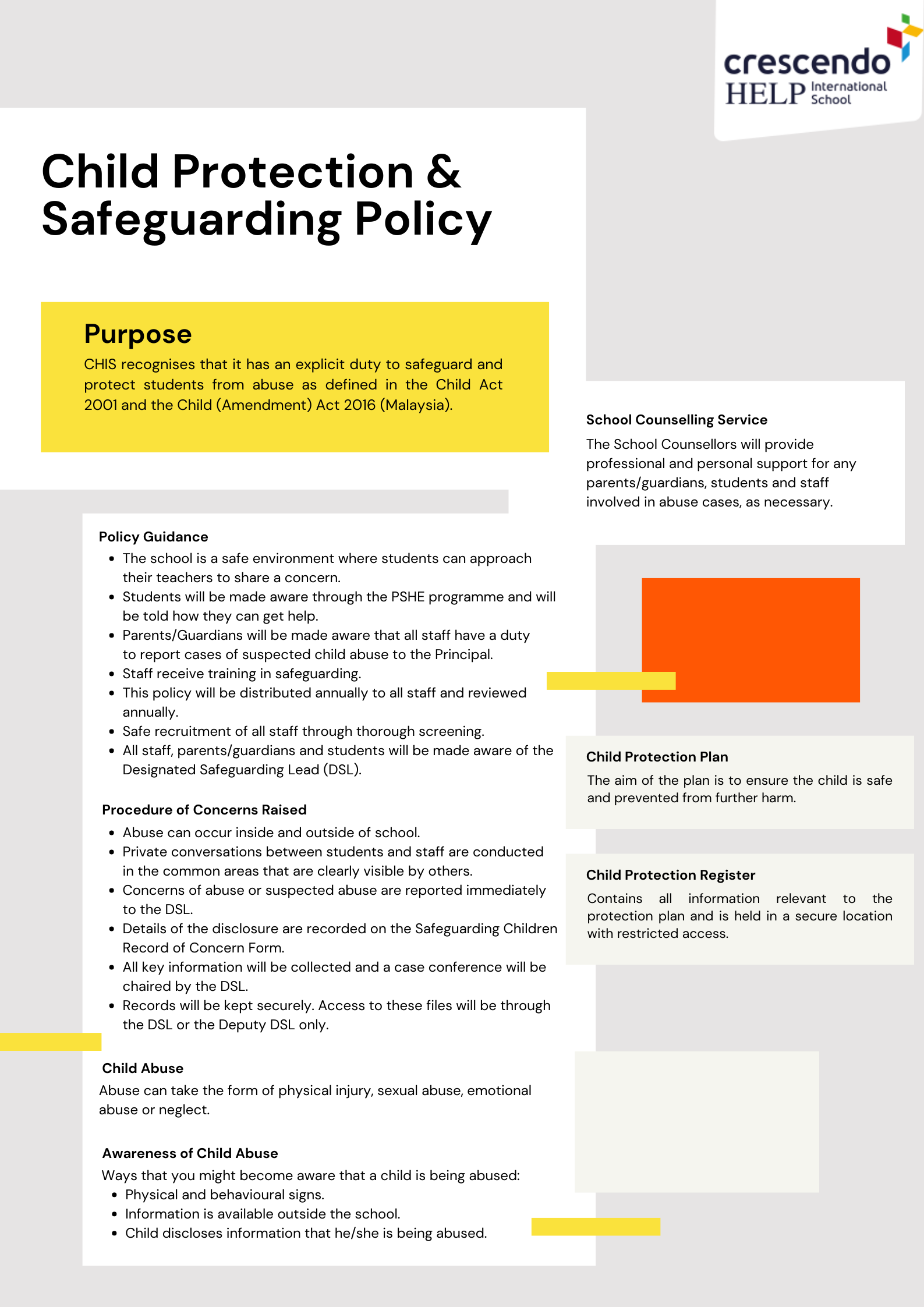 Crescendo-HELP International School takes the protection of our children seriously. In alignment with our Mission, Vision and Guiding Principles, we have in place clear guidelines and procedures regarding acceptable behaviour within our school, including child protection and safety.
